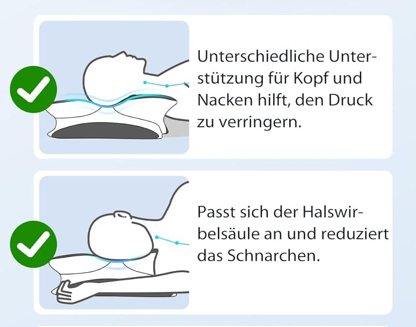 Das Kissen unterstützt gezielt die natürliche Ausrichtung deiner Wirbelsäule – dadurch werden Druckpunkte reduziert und Verspannungen im Nacken- und Schulterbereich effektiv gemindert.